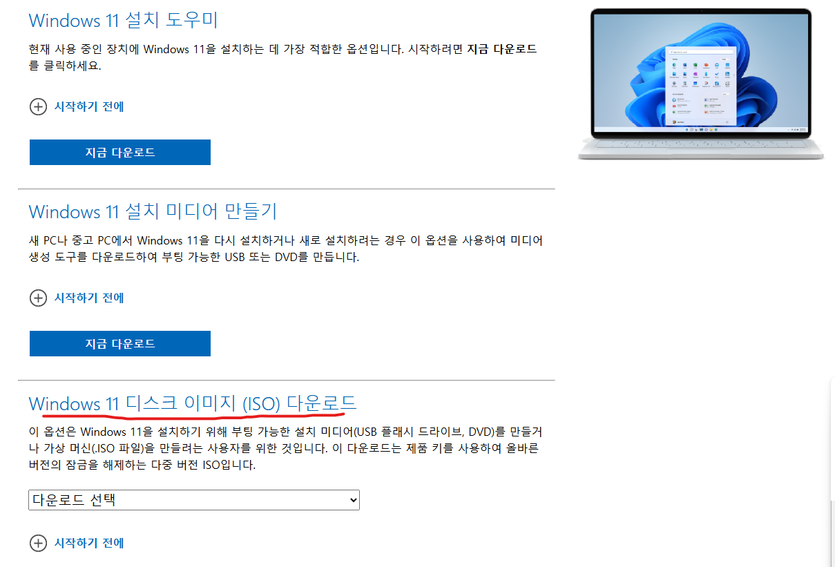 이 링크로 들어가보면 어딜 봐도 윈도우 11처럼 이미지 다운로드를 찾을 수 없습니다.
