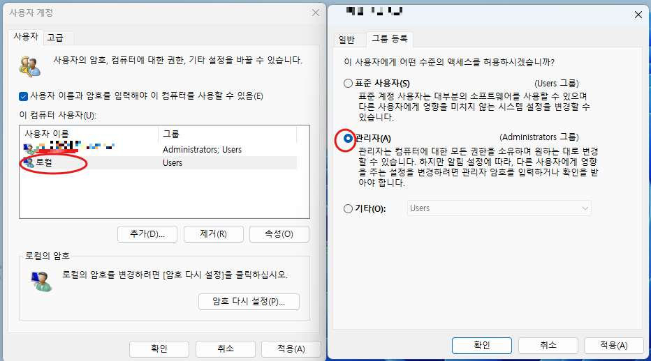 - 마지막으로, 사용자 이름과 암호를 입력해야 이 컴퓨터를 사용할 수 있음을 체크 해제해줍시다. 로컬 계정의 비밀번호를 묻는 창이 나올텐데, 여러분들이 설정해둔 비밀번호를 입력하거나 없다면 비워둔 그대로 확인을 눌러줍시다.