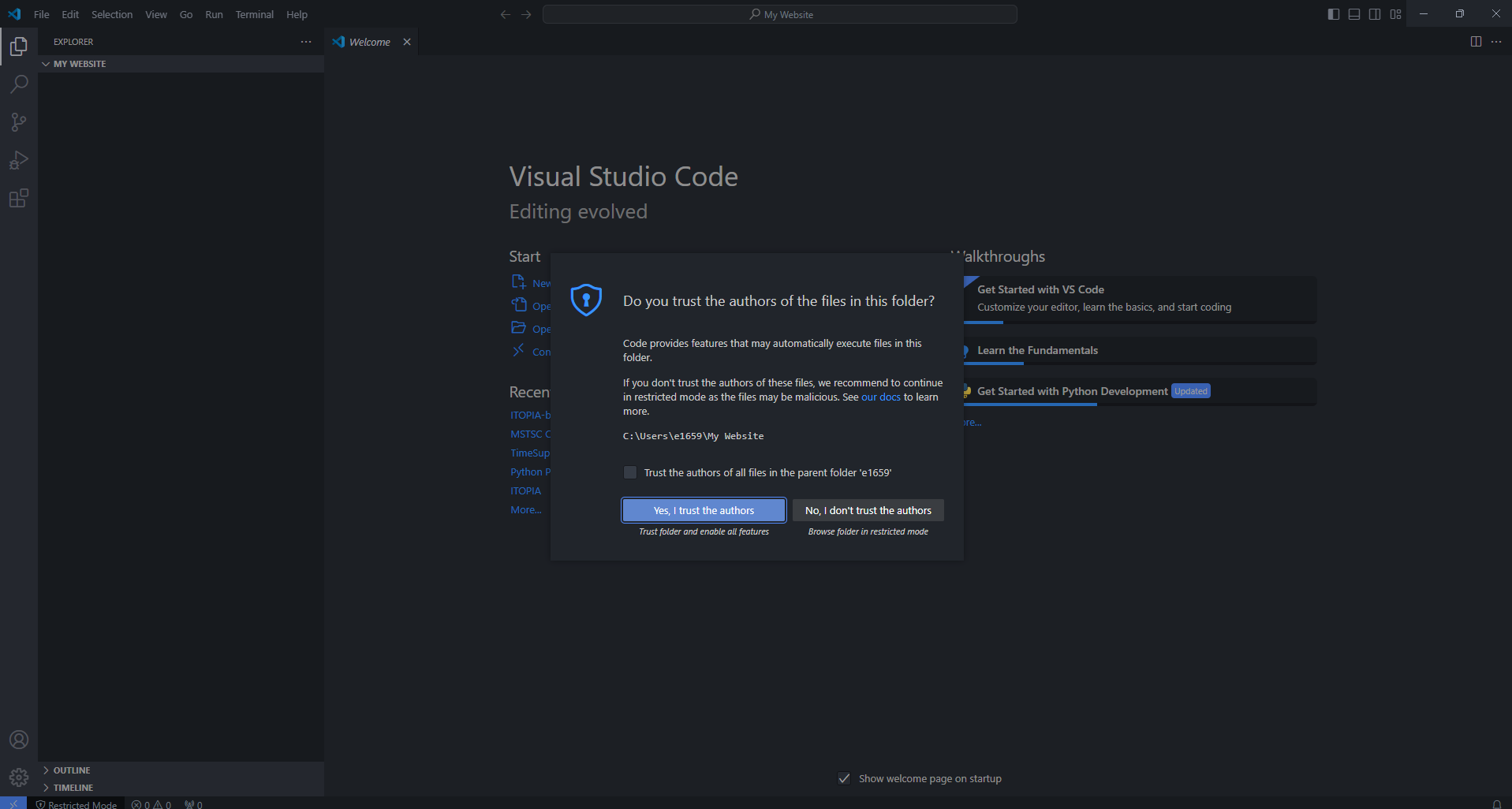 열었다면 이런 메시지가 표시됩니다. 이 폴더안의 파일들을 신뢰할 수 있냐고 묻는 내용입니다. 남의 코드가 아닌 저희가 직접 코딩할 것이니 'Yes, I trust the authors'를 눌러줍시다.