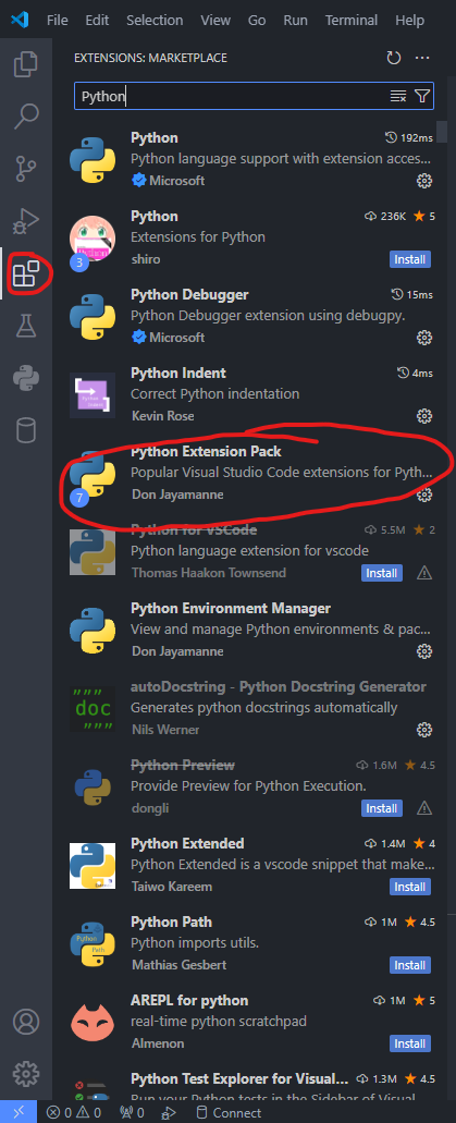 하지만 그전에, 파이썬 파일을 디버깅하기 위한 Visual Studio Code의 확장 프로그램들을 설치해봅시다. 아래 사진을 참조하여 왼쪽 툴바에서 'Extensions'를 선택한 후, 검색창에 'Python'을 검색하여 'Python Extension Pack'을 설치하여 주세요.