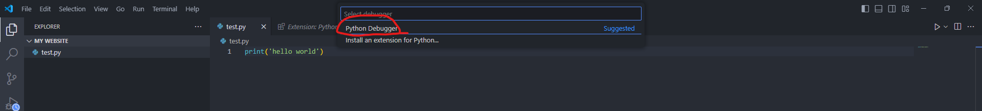 'F5'키를 누르면 VSCode 창 가운데 윗부분에 'Select a Debugger'라는 메시지가 나옵니다.