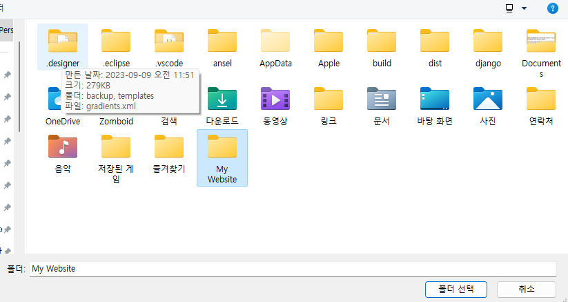 문제 없이 설치되었다면, 자신이 원하는 경로에 새 폴더를 하나 만들고 그곳에 파이썬 파일을 만들어 실행해볼겁니다. Open Folder 버튼을 눌러, 방금 만든 새 폴더를 열어주세요. 저의 경우는 'MyWebsite'라는 폴더를 만들어서 진행해보겠습니다.