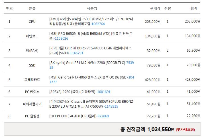 - 라이젠 7500F와 DDR5 RAM을 사용한 시스템입니다. 위의 80만원 견적과 게이밍 성능 면에서 많은 차이는 없지만, 추후 업그레이드를 고려하시는 분들에게 추천드리는 견적입니다.