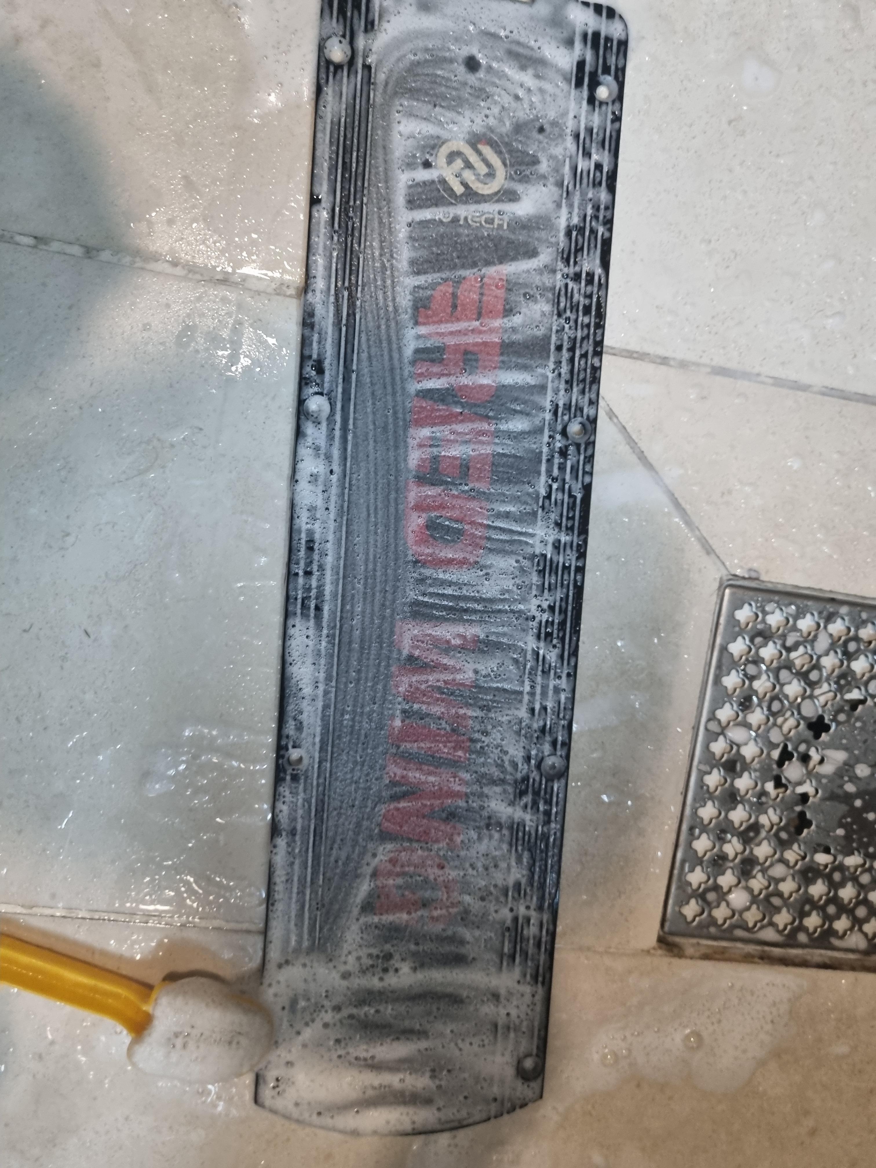 2) 발판을 킥보드 전방 쪽으로 밀어서 분리하신 다음, 욕실에서 치약을 바르고 솔로 잘 문지른 다음에 씻어내줍니다. 이 때, 나사도 녹이 슬어있다면 마찬가지로 치약을 이용해서 솔로 문질러주시면 녹이 벗겨집니다.