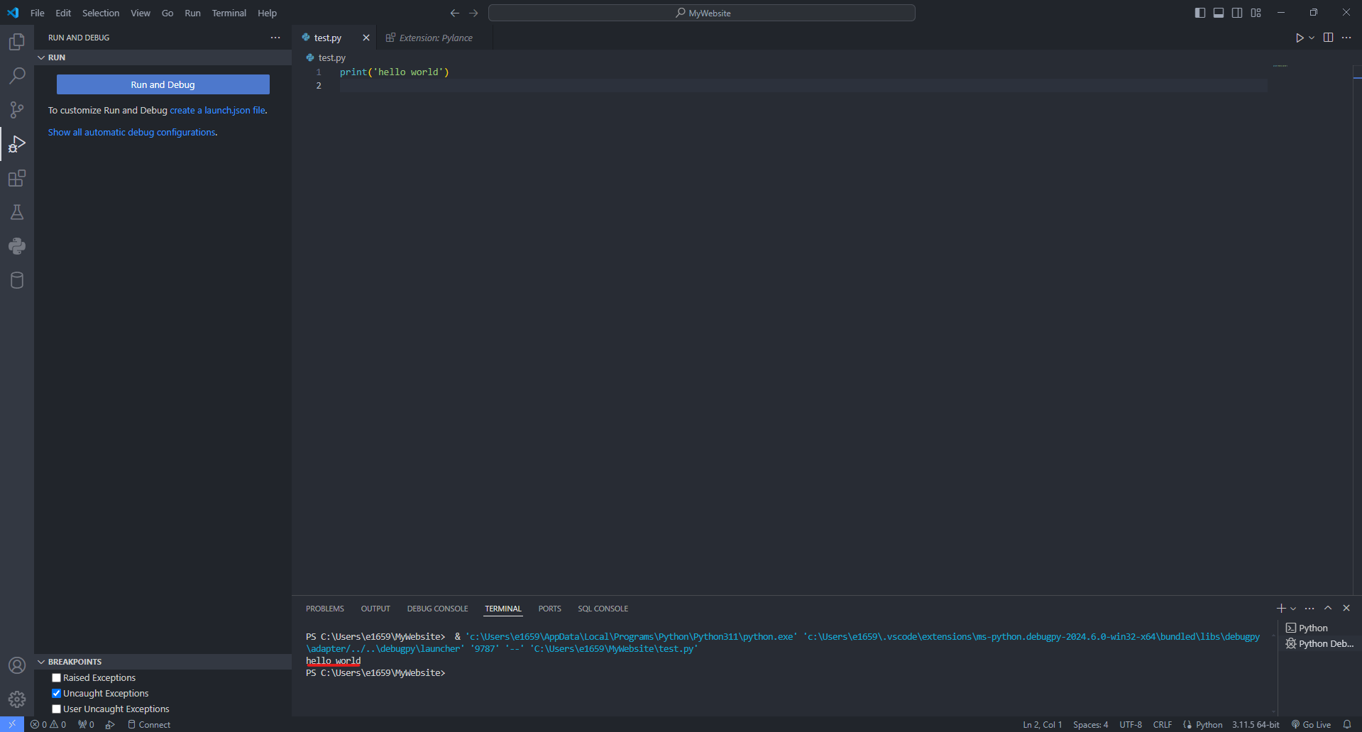 우리가 작성한 코드를 실행해보려면 VSCode에서는 키보드의 'F5'키를 사용합니다. 흔히 얘기하는 디버깅이죠.