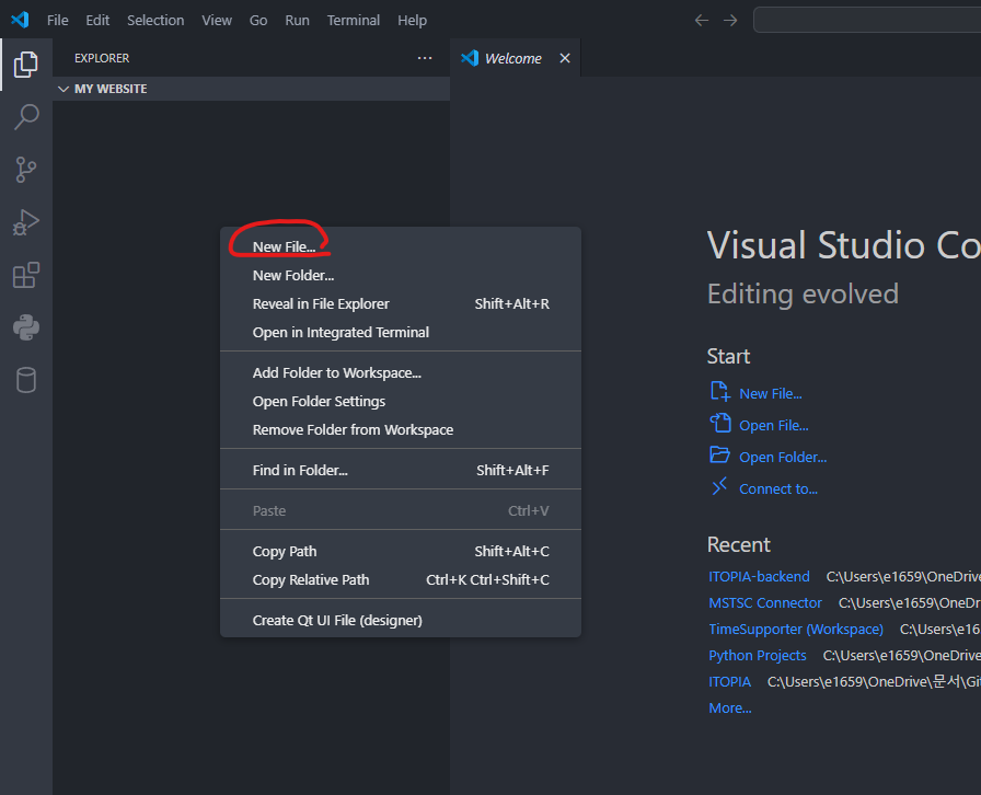 Explorer창에서 'MYWEBSITE(폴더 이름)' 밑의 빈공간에 마우스 우클릭을 하여 'New File...'을 클릭한 다음,