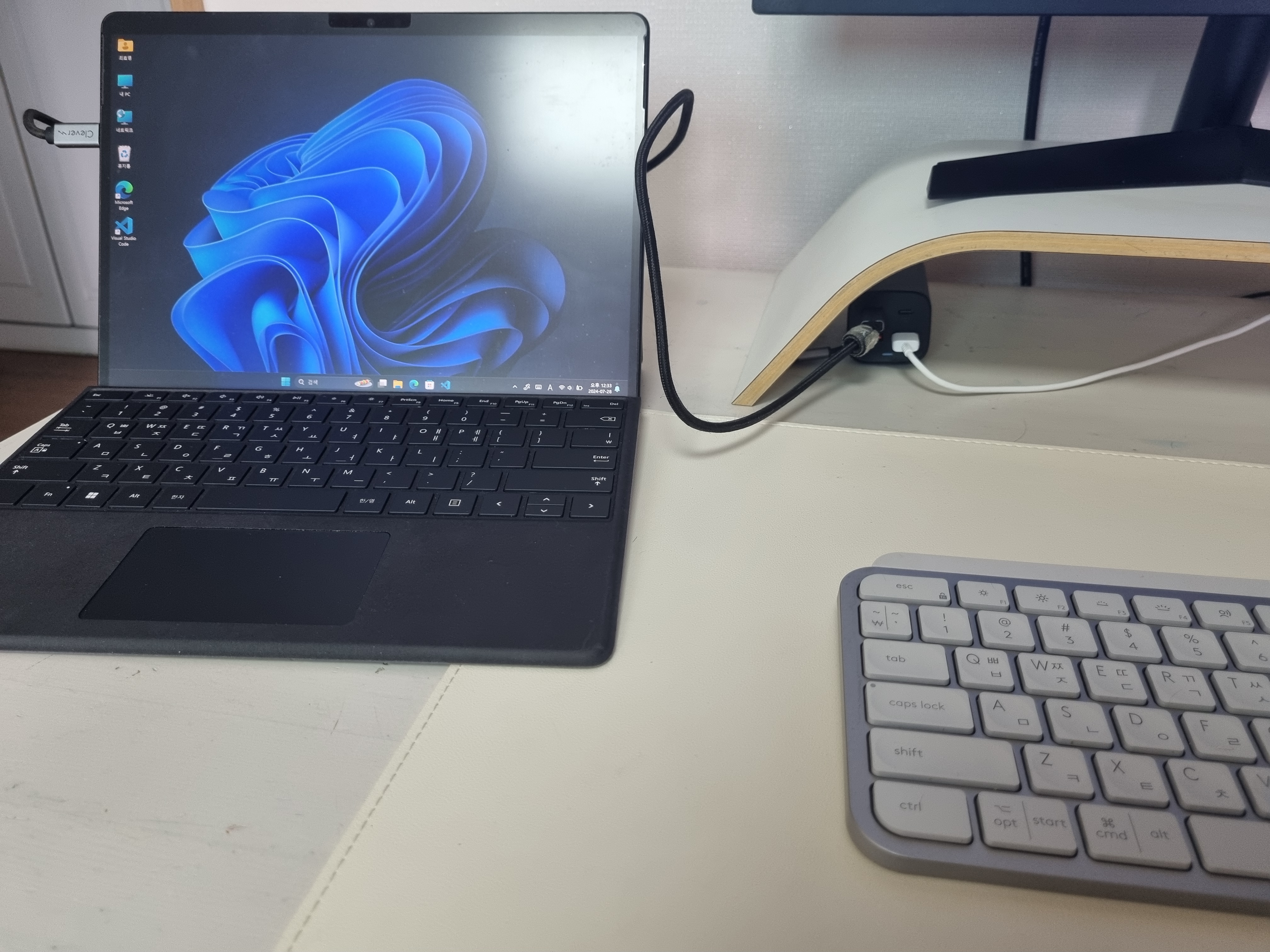 - 휴대폰 무선 충전기와 Surface Pro 9, 로지텍 헤드셋, 무선 키보드 등 각종 USB-C 형태의 충전 단자를 필요로 하는 기기들에 연결하여 사용 중입니다.