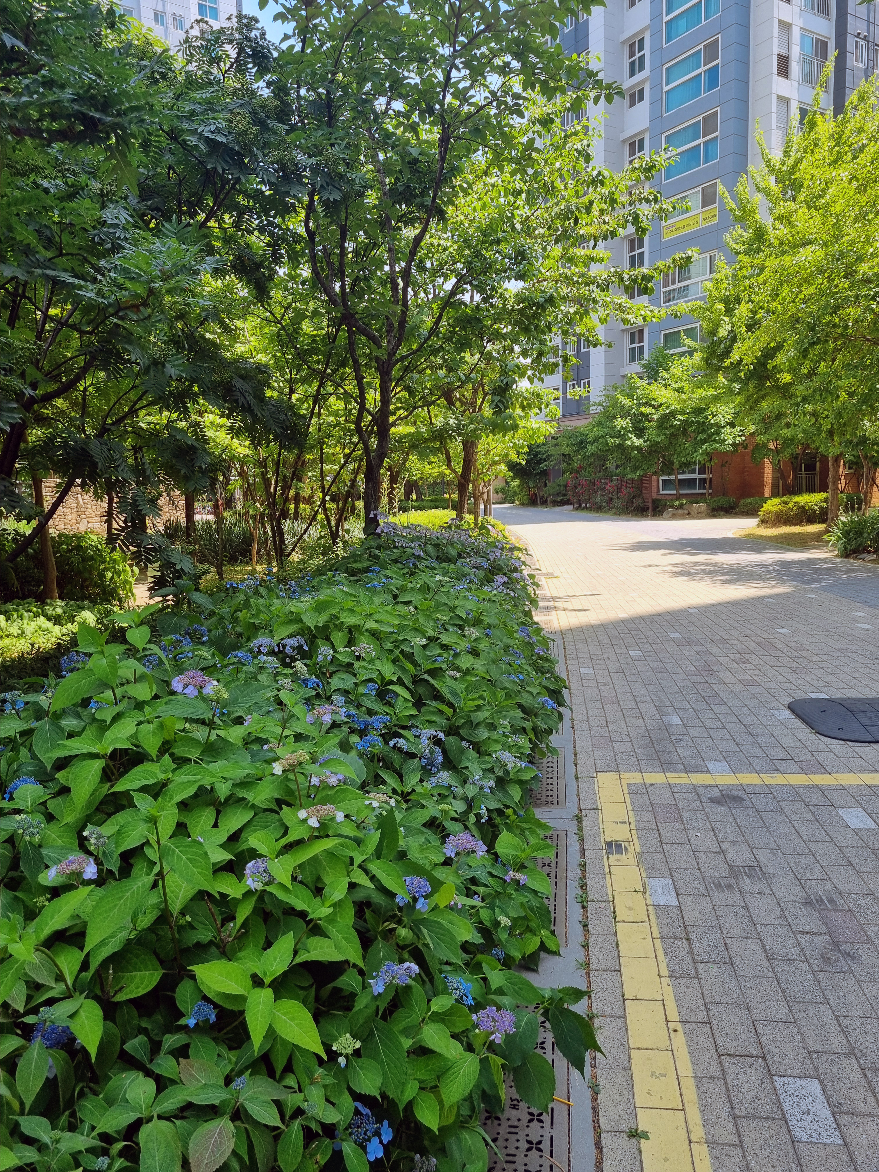 그건 그렇고, 아파트 화단은 이렇다할 관리를 안 해주는데도 이렇게 꽃들이 보라빛과 푸른 빛으로 잘 자라네요... 수국은 노지에 던져놓고 키우란 말을 들어본 것 같았는데 역시 방치하고 키우는게 더 괜찮은 식물인걸까요? 내심 핑크빛으로 자란 저희 집 수국이 다시 한 번 원망(?)스러워 집니다.
