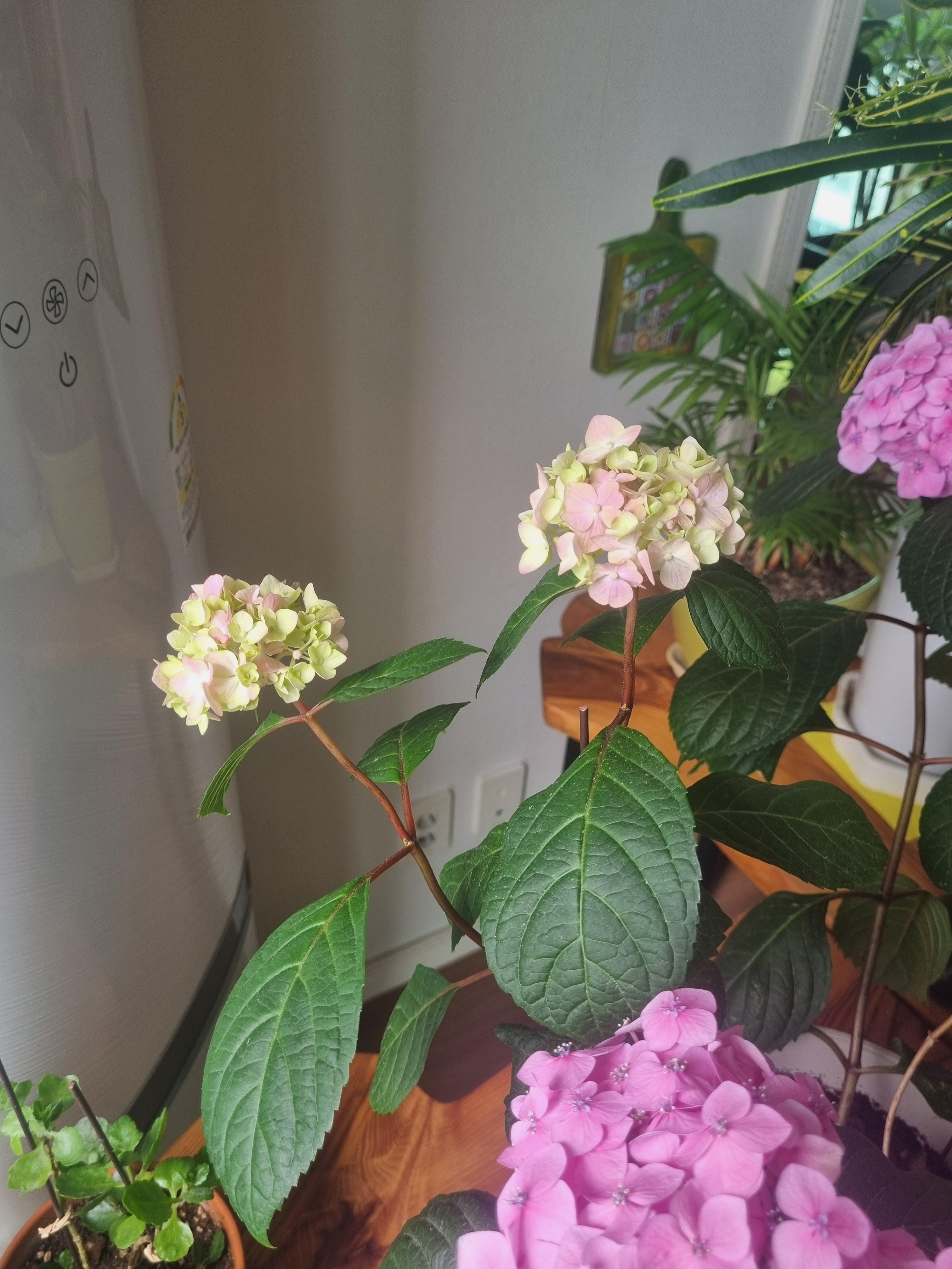 반면에 지금 막 피어나는 수국 꽃도 아직 있습니다. 전년지에서 올라온 두개의 작은 가지에서 귀여운 꽃송이 두 개가 이제야 막 꽃이 피어 물들어가고 있습니다. 얘들도 역시 핑크네요. 구연산이랑 명반을 그렇게 줬는데... 내년에 분갈이 할 때는 아무래도 명반과 유황을 갈아서 흙 밑에다가 섞어주는 식으로 키워봐야 할 것 같습니다. 수국 전용 파란색 상토에다가도 심고 명반도 뿌리고 구연산도 줘 봤지만 아무래도 토질을 바꾸기가 쉽지 않은 것 같네요.