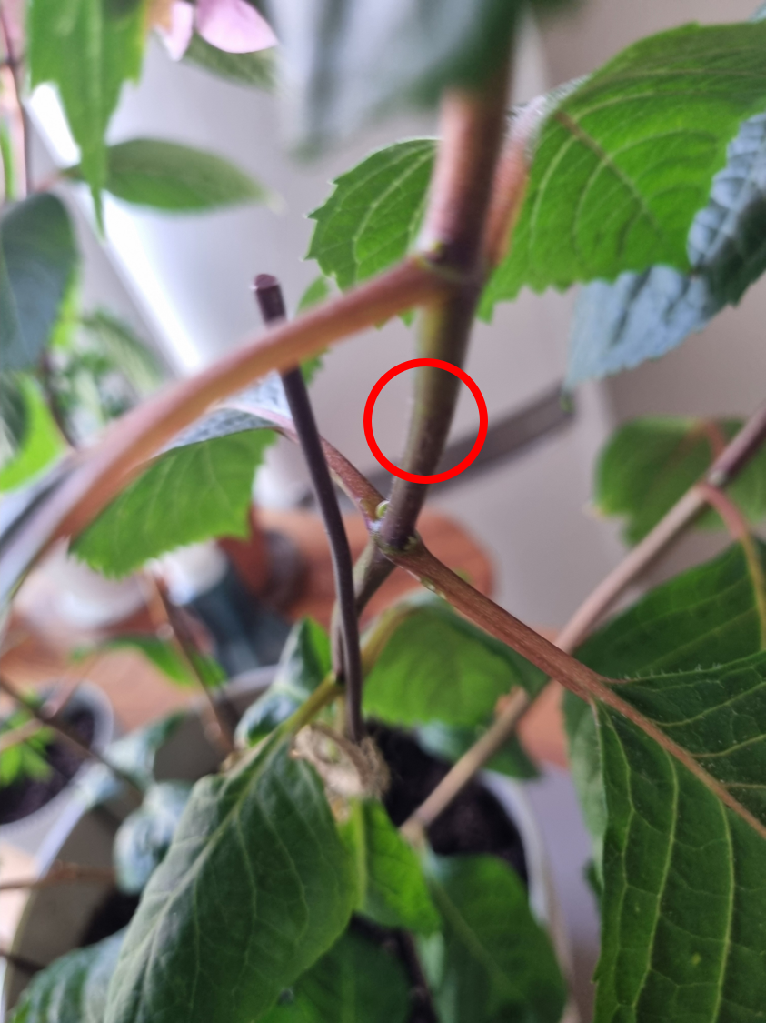 꽃볼쪽과 가깝게 줄기를 최소한으로 잘라주는 '데드헤딩'을 할 수 있긴 하나, 저는 잎눈이 비교적 튼실해보이는 쪽에서 가지를 내고 싶어서 한 마디 정도 더 내려와서 가지치기를 해주기로 했습니다. 가지치기를 할 때에는 도구를 소독해주는 것 잊지 마세요. 안 그러면 식물이 병에 걸릴 수도 있습니다.