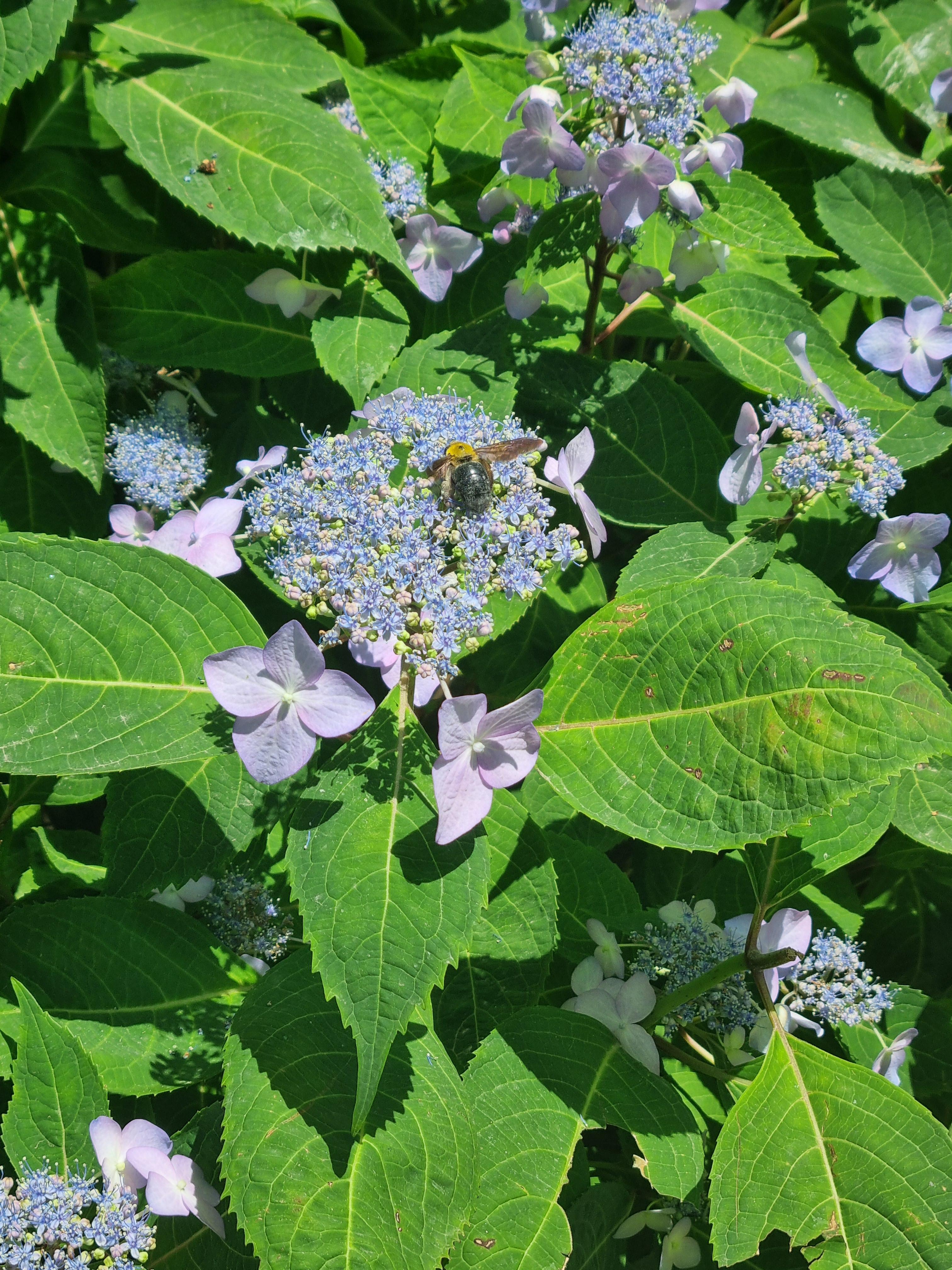 흔히들 수국은 향기가 없다고 알고 있지만, 제가 키우는 수국은 경험상 그렇지 않았습니다. 아주 미미하게나마 향기가 있긴 합니다. 산수국에 코를 대고 향기를 맡아보기엔 보는 눈이 많아 부끄러워 그러진 않았지만, 저희 집 수국도 참꽃에 코를 가까이 대고 향기를 맡으면 은은한 장미향과 풀냄새가 섞인 듯한 향기가 나니, 아파트 산수국도 비슷한 냄새가 나지 않을까 싶네요. 아마 벌도 참꽃 주변의 예쁜 가꽃과 향기를 맡고 오는게 아닌가 추측해봅니다.