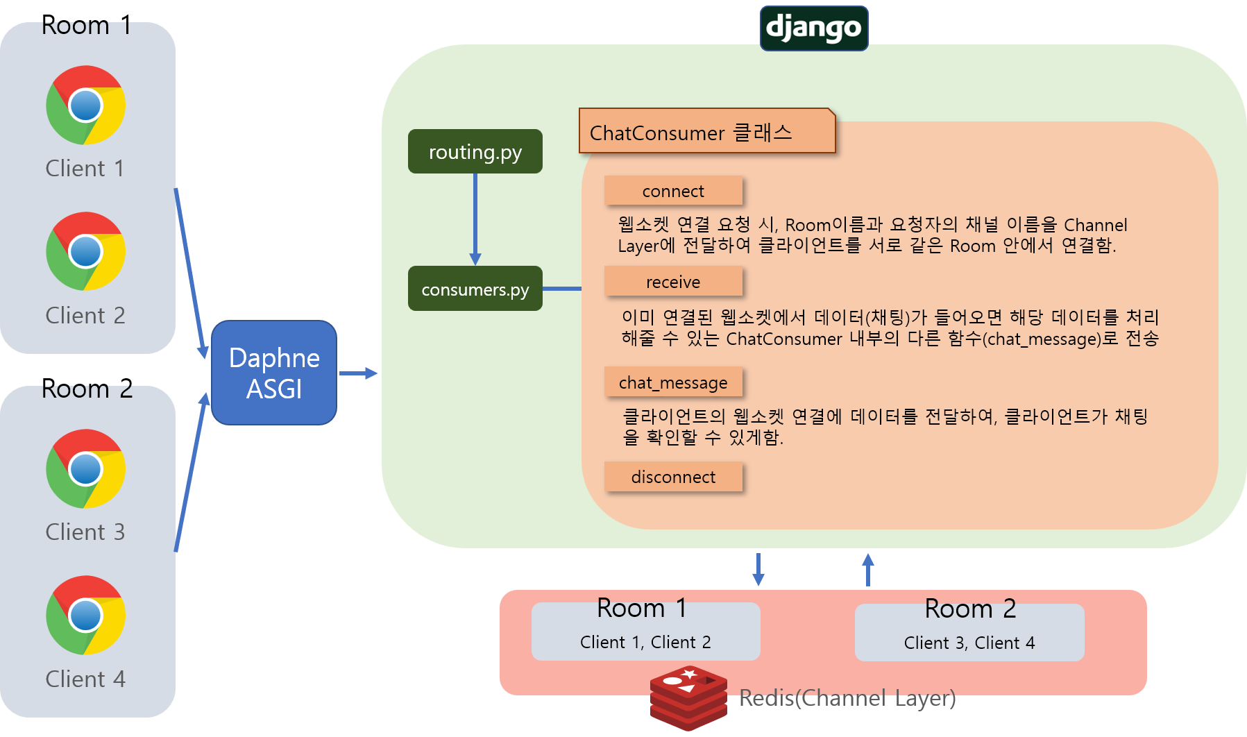 안녕하세요. 지난 포스트에서 저희는 Channels를 이용할 밑준비를 마쳤습니다.오늘은 다음 코드를 작성하기 전에, 저희가 설계할 실시간 채팅의 구조와 각각의 요소들이 어떤 역할을 하는지 한번 알아보겠습니다. 아래의 그림을 한번 볼까요? (들어가기 전, 이 포스트는 비전공자가 독학으로 공부하여 작성하는 포스트입니다. 현업 개발자 분들은 보시다가 '아 코딩 그렇게 하는거 아닌데' 하실 수 있습니다. 모든 지적과 질문은 감사히 받겠습니다.) 1. 그래서 Channel Layer랑 이 함수들이 뭘 하는데? Channel LayerChannel Layer는 여러개의 Consumer(클라이언트)가 서로간에 통신(채팅)할 수 있게 해주는 역할을 하고, 다른 Django의 요소(View 등)와도 이어질 수 있게하는 ..