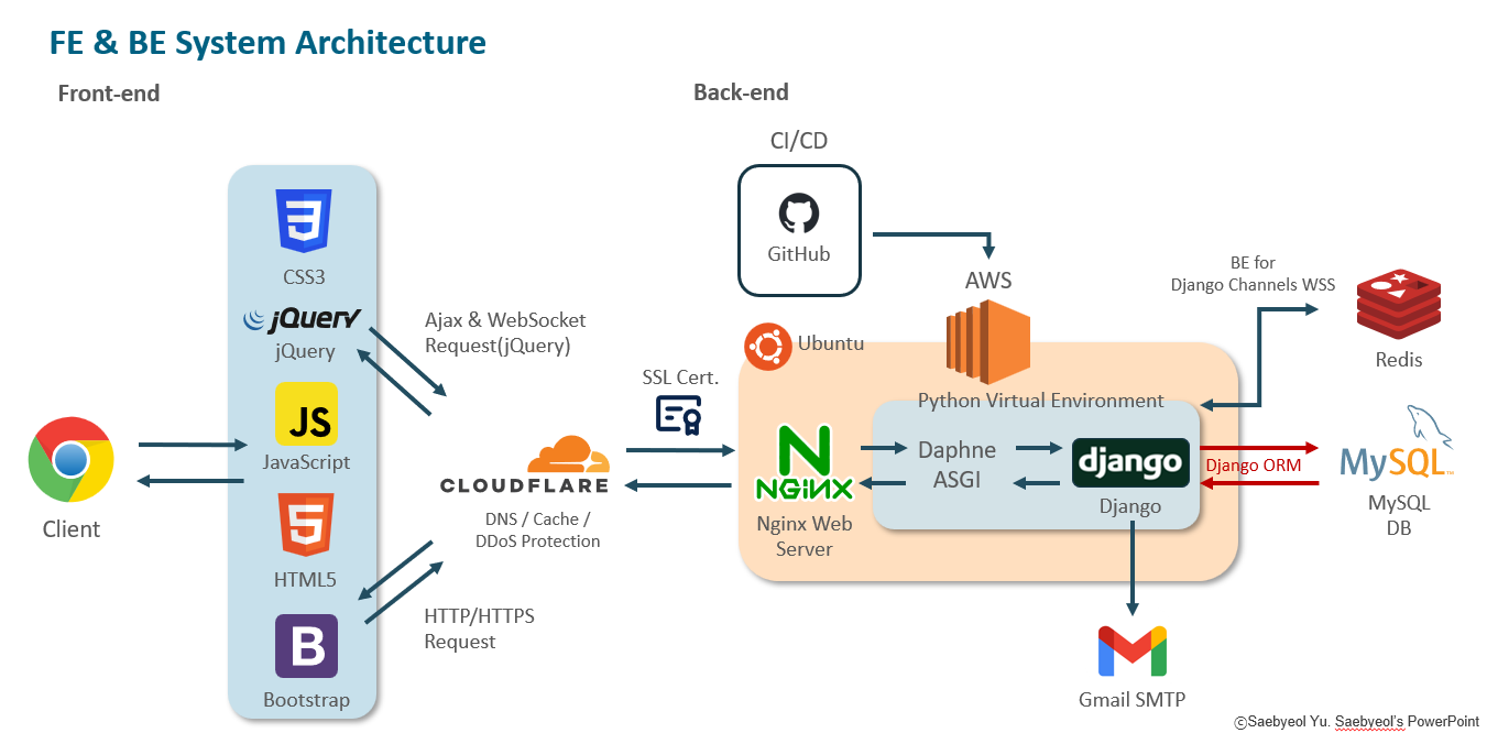 지난 포스팅에서 Python 개발환경 까지 설정했습니다. 이제 우리는 웹사이트를 만들기 위한 다른 여러가지 기술들과 컴퓨터 언어들이 필요합니다.아래의 그림을 살펴보고 가겠습니다.  이게 우리가 만들 웹사이트의 전체적인 구조입니다.한번 전체적인 그림에서부터 작은 요소까지 중요 사항 위주로 설명드리면서 넘어가보도록 하겠습니다. 쉬운 설명을 위해 웹사이트를 레스토랑이라고 비유하면서 설명드리겠습니다. 1. 프론트엔드(Front-end)- 프론트엔드란?쉽게 말하자면, 웹사이트 사용자에게 보여지는 것들입니다.네이버 홈페이지를 예로 들어보겠습니다.세세한 메일버튼, 로그인 버튼, 날씨, 뉴스창 이 모든 것들이 전부 프론트엔드 입니다.즉, 웹사이트의 구조와 디자인, 일부 동작들이 여기에 해당하는겁니다.프론트엔드에서 우리..